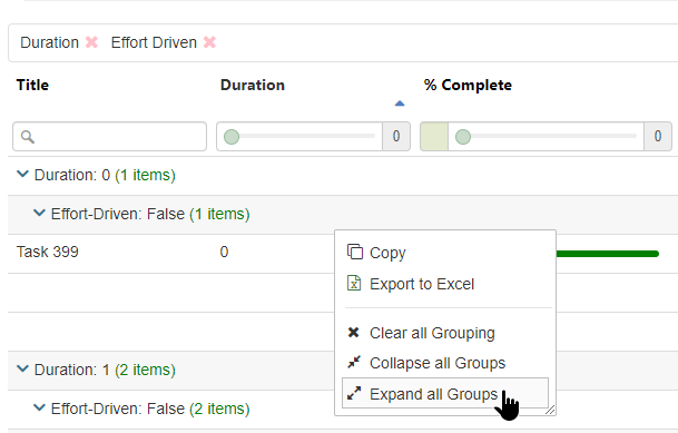 A Context Menu is triggered by a mouse right+click and can show a list of Commands (to execute an action) and/or Options (to change the value of a field). The lib comes with a default list of custom commands (copy cell, export & grouping commands). Also note that the Commands list is following the same structure used in the Cell Menu, Header Menu & Grid Menu. Very similar to the Cell Menu, they were both created as SlickGrid plugins during the same period, their main difference is that they get triggered differently (mouse right+click vs cell click) and they serve different purposes. The Cell Menu is more oriented on a row action (e.g. delete current row) while the Context Menu is all about actions for the entire grid (e.g. export to Excel).