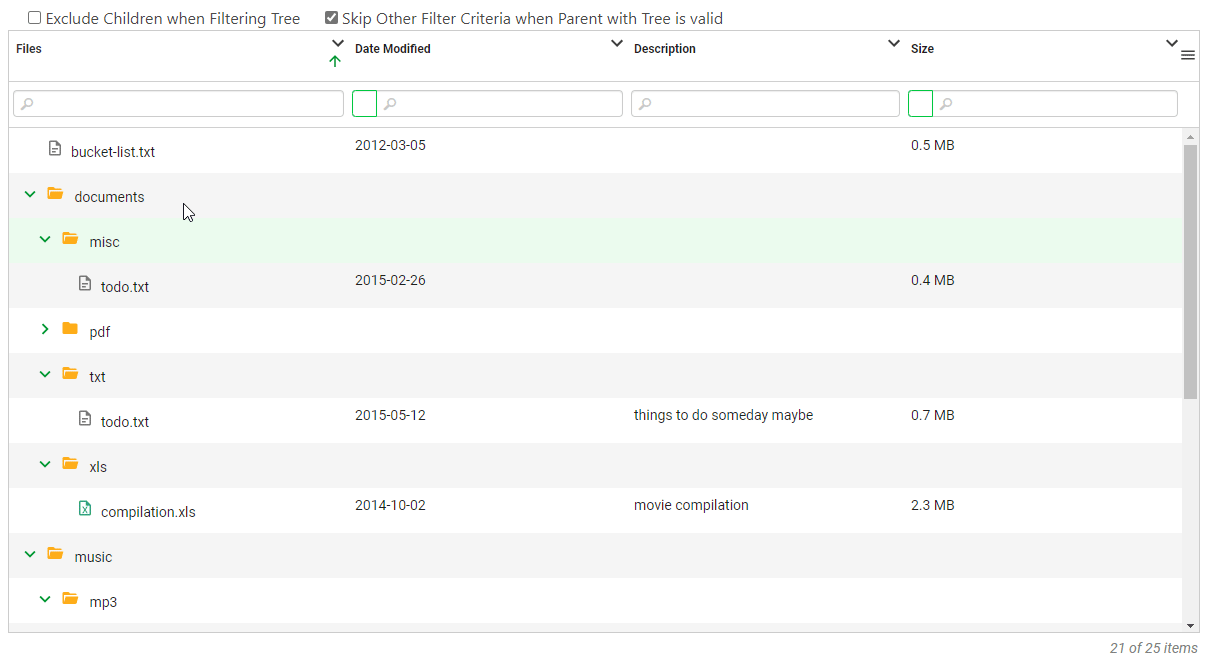 For demo purpose, let's take Example 29 live demo, if we filter with the word music on the "Files" column and also a Size that is > 15 nothing will show up unless we have this flag enabled. The reason is because none of the files have both criteria passing at the same time, however the "Files" column (which is the Tree column) does pass the filter criteria of music and so this flag will work and show the folder "music" because we skipped all other criteria, in our case > 15 on that line, note however that on the following lines (all children), it will require all filters to be valid (and so we are able to see any files under the "music" folder that have a size greater than 15Mb).