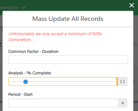 The use case would be to skip a change, in silent without any errors shown, if another column or property has value(s) that do not match our condition expectaation. A possible use case could be found under Example 12, the use case that we could do is the following: "Do not apply a mass change on the 'Duration' column that is below 5 days if its 'Complexity' column is set to 'Complex' or 'Very Complex'", the code do this use case is shown below. Also note that the 3rd argument of onSave (in our case dataContextOrUpdatedDatasetPreview) will have the updated dataset but without the change(s) that got skipped