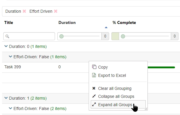 A Context Menu is triggered by a mouse right+click and can show a list of Commands (to execute an action) and/or Options (to change the value of a field). The lib comes with a default list of custom commands (copy cell, export & grouping commands). Also note that the Commands list is following the same structure used in the Cell Menu, Header Menu & Grid Menu. Very similar to the Cell Menu, they were both created as SlickGrid plugins during the same period, their main difference is that they get triggered differently (mouse right+click vs cell click) and they serve different purposes. The Cell Menu is more oriented on a row action (e.g. delete current row) while the Context Menu is all about actions for the entire grid (e.g. export to Excel).